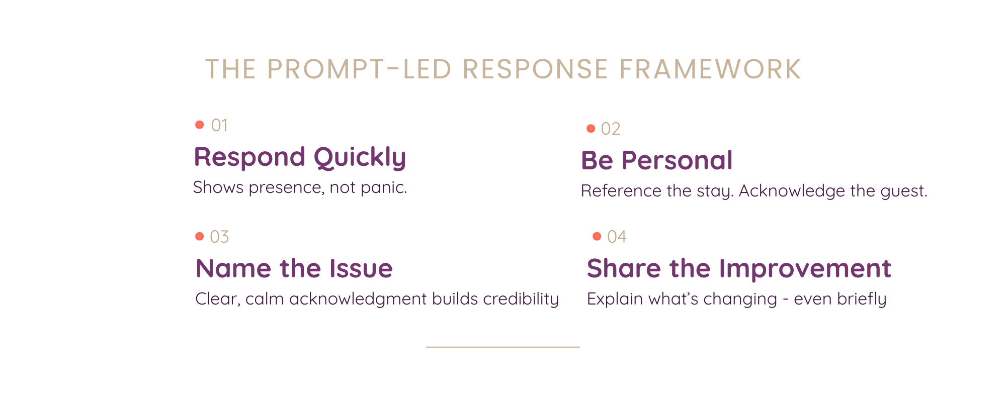 Avoiding the problem erodes trust. Strong responses name the concern clearly, express understanding, and validate the guest’s experience — without defensiveness.